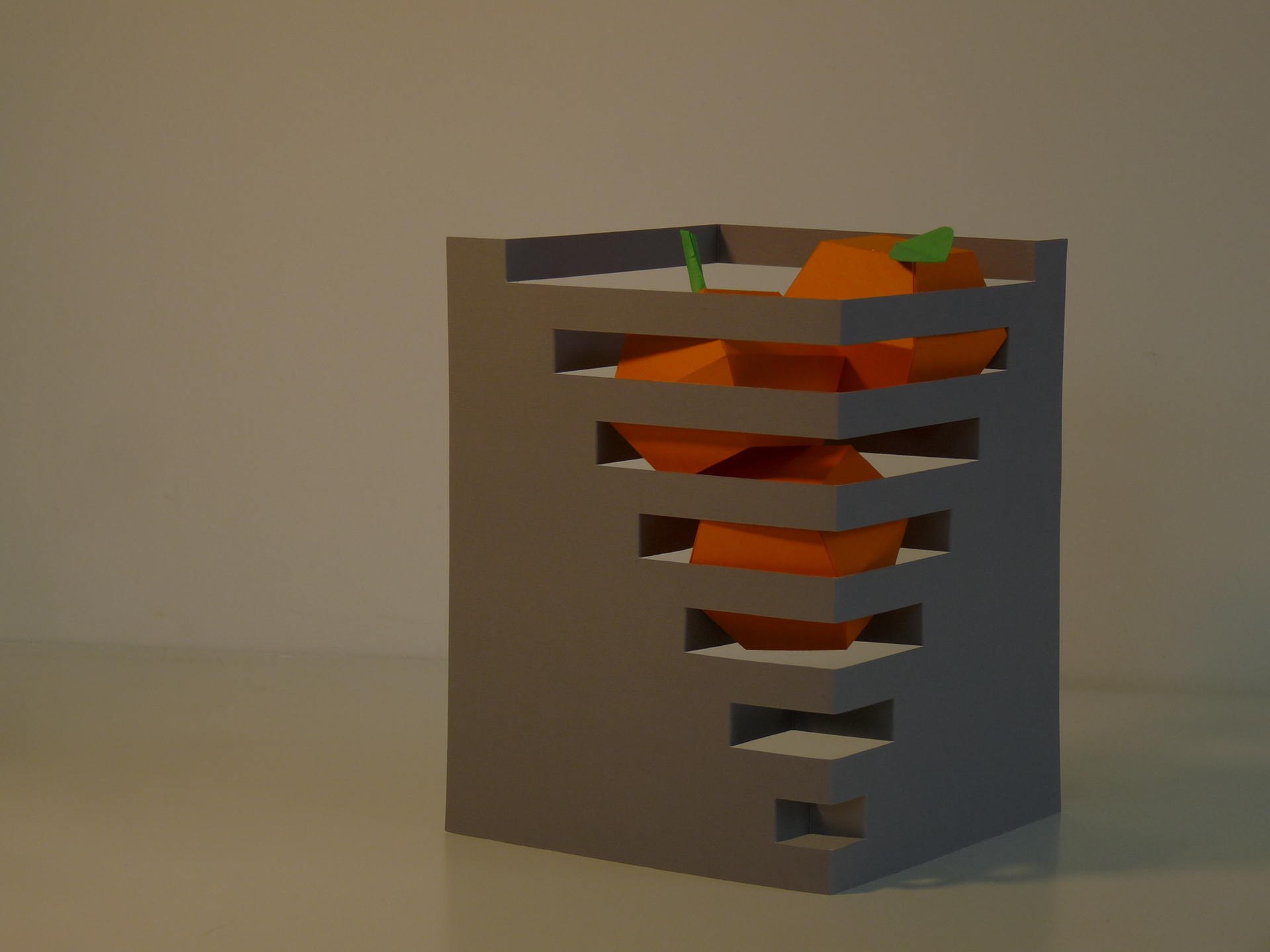 Projeto de fruteira utilizando apenas corte e vinco, sem perda de material.